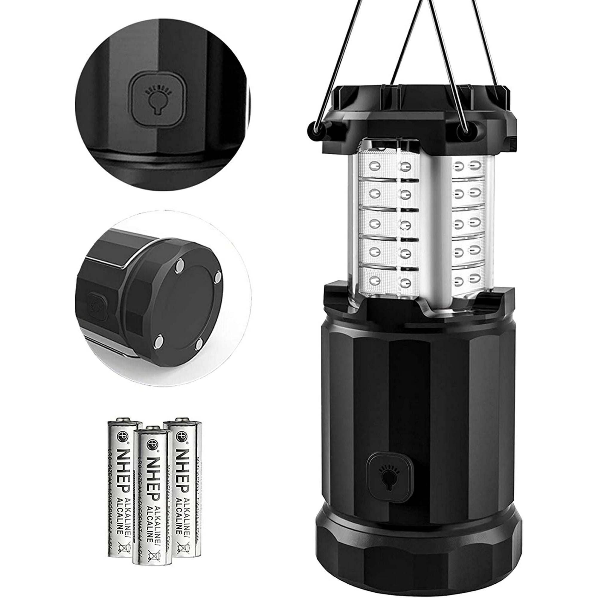 Enjoy Outdoor Adventure & Entertainment with Etekcity unique design upgraded compact camping led lantern. Dimmer Button: adjust the brightness in different situation. Brighten Camping: Emits 140 Lumens of light with a 360 degree range. Magnetic Base: 4 Ultra strong magnets enable it to stick firmly to any metallic surface. Collapsible Design: compact and portable, 3.27*5.39 inch in close; 3.27*7.76 inch in open; 3.27* 10.7inch with handles. Extended Fold-away Handle: provide more possibility for everyone. Battery Powered: coming with 3 AA batteries in each lantern, easy for change. Locking Handles: Avoid accidentally activating and wasting the lantern's power. Storage Space: using up top spare space for on-hand tinder, batteries or other small accessories. Fire Starter: great buddy for your adventure camping, hiking etc. Suitable for camping, hiking, fishing, backpacking. Anyplace anytime with power outage: storm, hurricane, snow, emergency and survival situation. Car repairing, garage, tent, indoor and outdoor place? Those seeking for a gift for friends, kids, family. Worry free, 90-day return refund guarantee! 2-year warranty and lifetime support by Etekcity. FCC, ROHS certified. Package includes: 2 Ultra Bright Lanterns, 2 Fire Starters, 6 AA Batteries, and 1 Manual. NOTE: It is not recommended to use the lantern in sub-water.